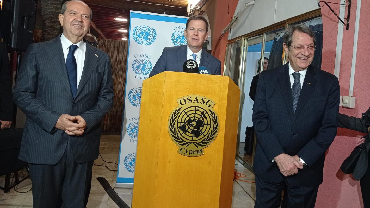 SRSG/DSASG Colin Stewart, welcomed the Turkish Cypriot leader, H.E. Mr. Ersin Tatar and the Greek Cypriot leader, H.E. Mr. Nicos Anastasiades and representatives of the diplomatic community, civil society and the media to Ledra Palace Hotel in the buffer zone on the evening of 7 December 2022.