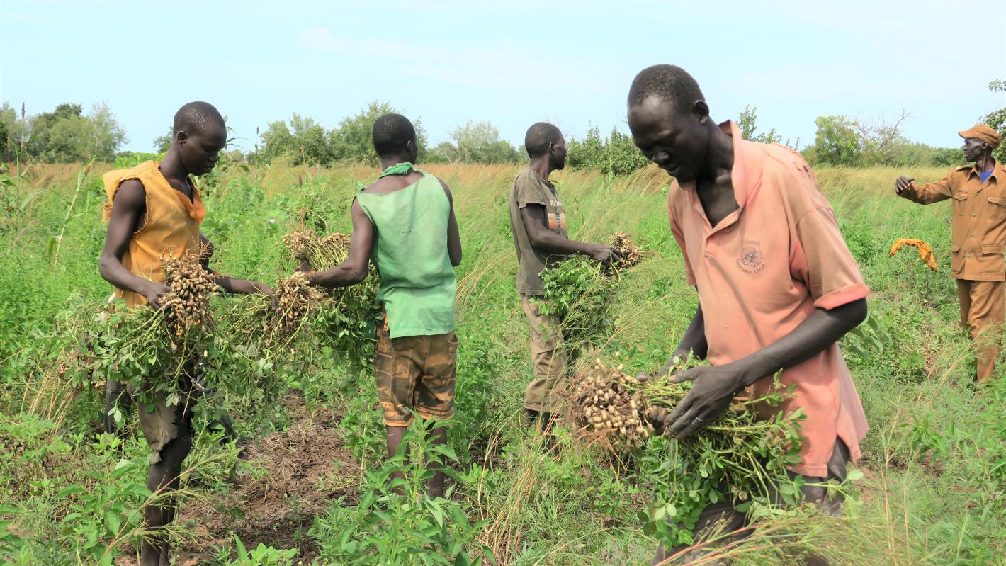 WESTERN BAHR EL GHAZAL – With severe climate shocks, including severe floods and prolonged dry spells, the world’s newest nation, South Sudan, has been impacted by shortfalls in food production. The situation is exacerbated by rising regional tensions, including the ongoing conflict in neighbouring Sudan as well as the situation in Gambella, Ethiopia, due to which tens of thousands of returnees and refugees are seeking shelter here. Consequently, regular food imports have stalled while competition over already scarce resources is increasing every day. In Western Bahr El Ghazal, food insecurity is taking a specific toll on prisoners, given a consistent increase in detainees that leads to inevitable overcrowding in prisons.“Wau Central Prison is currently holding more than 1,200 inmates in a space that is equipped to cater to a mere 200,” revealed Major General Fidelle Mabior Majok, State Director of Prisons. “We don’t have enough space for them to sleep, let alone enough food,” he added.To support the National Prisons Service South Sudan (NPS), the United Nations Mission in South Sudan (UNMISS) and the Food and Agriculture Organization (FAO) came together to start a pilot project – the ‘Green Corrections Initiative.’It’s focus: to train the incarcerated in scientific ways to cultivate food crops as well as decongest the prison.“The NPSS has significant human and land-based resources. Therefore, we came up with the plan to transfer willing inmates to Thuro Majok, a locality on the outskirts of Wau, where the NPSS has around 200 acres at its disposal, and create a prison food farm,” explained Joseph Banda, a Corrections Officer working with the UN Peacekeeping mission in Wau. “We have used an ‘open camp’ concept by engaging inmates with short prison terms of up to three months, or those nearing the end of their sentences to produce their own food,” he added.Currently the Thuro Majok prison facility houses some 50 inmates at any given time. These prisoner-farmers rotate frequently.With UNMISS and FAO providing tools, training on agronomic best practices, as well as seeds, and with a little elbow grease from willing participants, harvesting has begun in this innovative prison farm. “It has been an immensely gratifying project. I was amazed to see the harvest at the Thuro Majok prison farm,” averred Tafiquil Islam, Head of the FAO Field Office in the state. “We will continue supporting the farm by providing gunny bags and plastic sheets to enable proper processing and storage of produce,” added Mr. Islam. For his part, Major General Majok says he is overjoyed.“I am impressed with the outcome. Currently, our storeroom has more than 200 bags of uncracked groundnuts, cowpeas, and sorghum. We will continue harvesting until December, when the round nuts will be ready. Additionally, some of this year’s yields will be used for the next planting season,” he stated.But perhaps the most heartfelt endorsement of this project’s success comes from James Kuoh. “Initially, I was hesitant when we were brought here. But now, thanks to the livelihood skills I have acquired tending to crops in the prison farm, I have hope that I will be able to build a good life once I complete my sentence,” he said with a smile.UNMISS plans to construct two additional structures in Thura Majok to accommodate more inmates and sustain the project until 2026.“We hope to replicate this model across South Sudan and expand it to communities, beyond prisons,” concluded Mr. Banda.