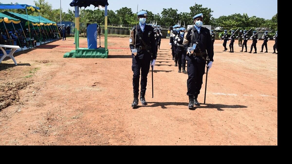 The Rwanda Formed Police Unit in Malakal pictured during a medal parade honouring their contributions towards building durable peace in South Sudan. These UNPOL officers have set a benchmark for being agile, nimble and robust, despite the COVID-19 pandemic, and for promoting gender parity within its ranks. 31 women police officers currently serve with their male counterparts here.