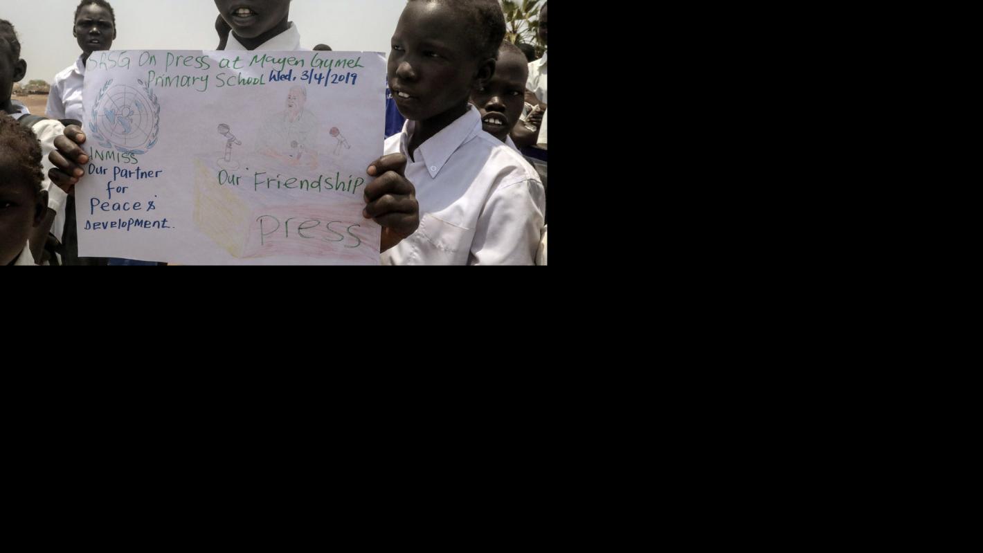 Excited little voices chant welcome messages as the head of the UN Mission in South Sudan (UNMISS) arrives at Mayen Gumel Primary School, located in the town of Kuajok, in north-western South Sudan.