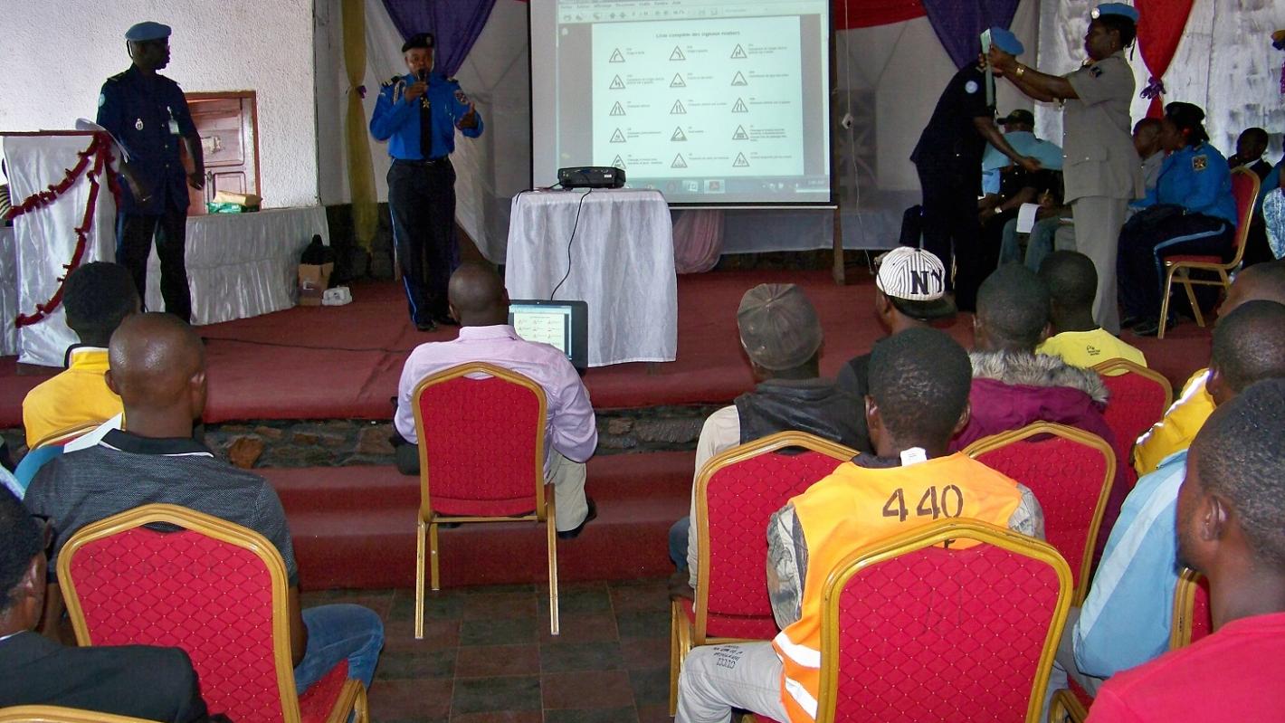 Kalemie – 5th October 2017 – After donating 83 road signs to Kalemie officials and Congolese National Police, the Mission organized a series of awareness sessions on the road signs for the different categories of roads users. The awareness firstly targets the road traffic regulating police, then the motorbikes drivers.