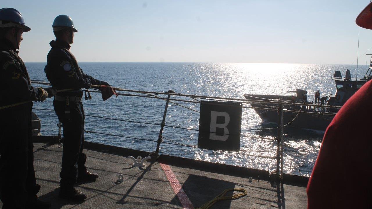 The purpose of the “Mailbag” exercise, conducted by the UNIFIL flagship Frigate “Independência” with the Lebanese vessel “LNS Tabarja” on 15 May, was to evaluate the performance of the personnel involved in replenishing at sea. The exercise, which is conducted regularly between the two forces, also involved delivering material, like spare parts or documents, from one ship to another.