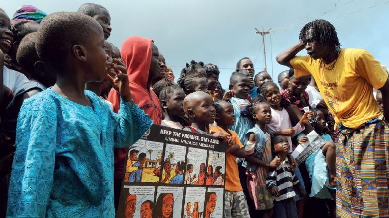 Comedian and UNMIL Peace Messenger, George Tamba (right), celebrated throughout Liberia as Boutini, performs in an AIDS awareness campaign. Photo: UNMIL | 22 Jun 11