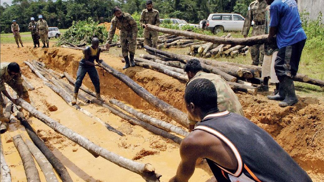 Pakistani troops and Liberian villagers repair a flooded road on the outskirts of Voinjama, Lofa County. Photo: Eric Kanalstein | UNMIL | 3 May 06