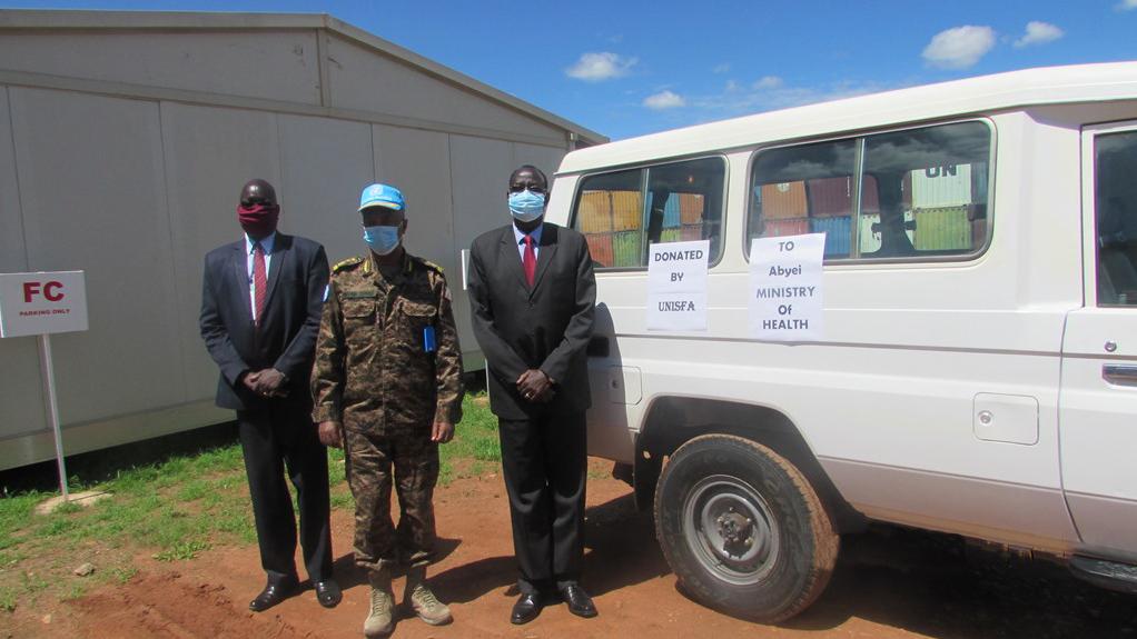 UNISFA’s Acting Head of Mission and Force Commander, Major General Mehari Gebremariam, presents the key of a Toyota Landcruiser to the new Juba Appointed Chief Administrator. The gift of the vehicle is part of the Mission’s overall support to the Ministry of Health of the host community in combating the spread of COVID-19 and to improve healthcare delivery system in the Area.