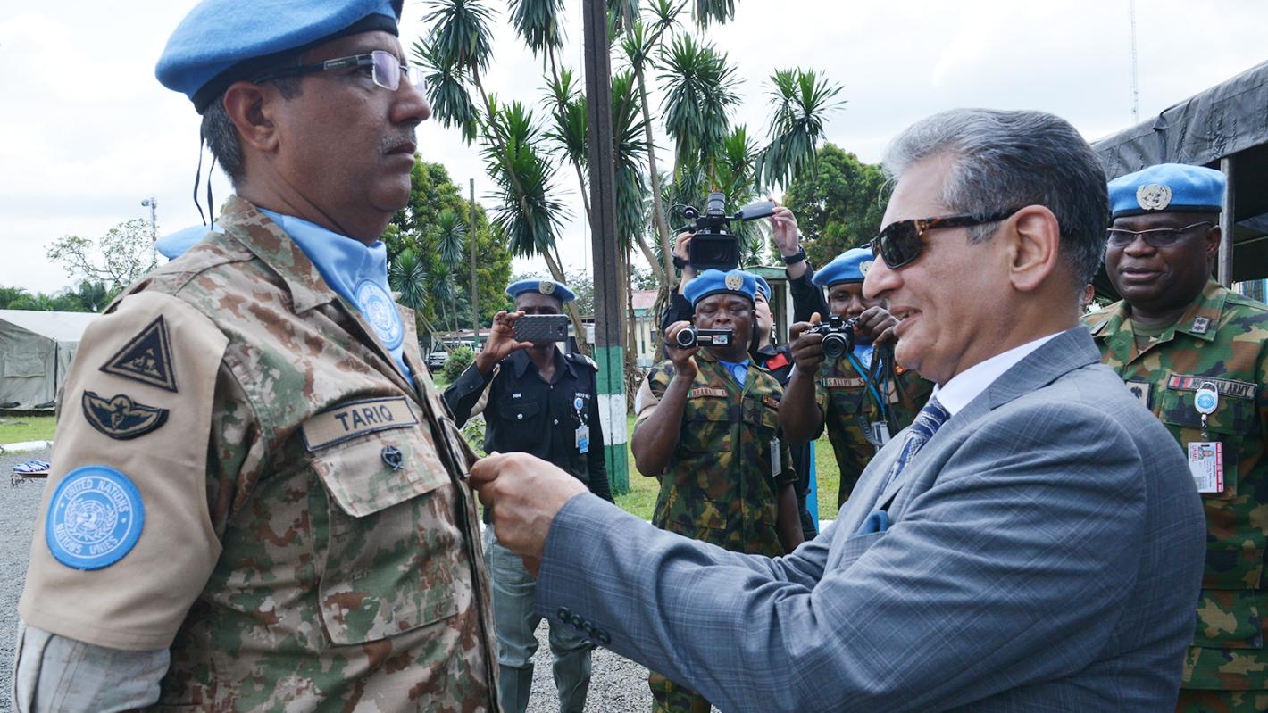 13 November 2017, Monrovia - 10 Staff Officers, 8 Military Observers, 230 members of the Nigerian Contingent and 69 officers of Pakistan Medical Contingent (PAKMED) serving with United Nations Mission in Liberia (UNMIL), today were awarded by the Special Representative of the Secretary-General (SRSG) Farid Zarif, with the United Nations Peacekeeping Medals in acknowledgement of their contribution to peace and stability in Liberia.