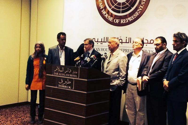The Special Representative of the Secretary-General for Libya, Bernardino Leon, with Libyan MPs speaking to the media after a meeting with the House of Representatives' members and its president. Tobruk, Monday 27 October…