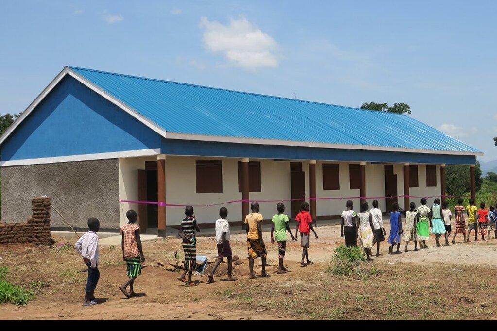 Some of the young learners marching in to their new school in a rural area of Eastern Equatoria State. Photos: Okello James/UNMISS UN peacekeepers in Torit in Eastern Equatoria State have handed over three new classrooms to…