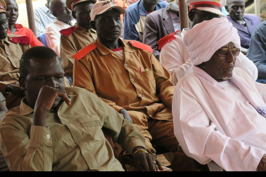 Civilians in Pageri listen attentively during a meeting with UNMISS peacekeepers during a patrol in Lobonok County, in the Jubek area. Recently displaced by fighting in the mountainous mining areas of Lobonok, civilians are…