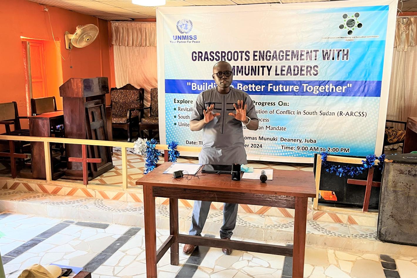 At a recent outreach event organized by UNMISS and peace partners in the Juba neighbourhood of Muniki, residents asked pertinent questions about social and political developments in their country. Photo by Blessings Samuel…