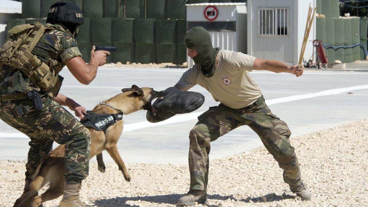 A Lebanese Special Forces soldier (left) and his combat dog apprehend an “aggressor” during attack dog training. The Lebanese Special Forces soldier calls his combat dog to heel. The dog who is already growling at the…