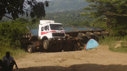 One truck driver standing near his capsized, heavily loaded vehicle vented his wrath on the government. "They put heavy taxes on us and yet nothing goes to road maintenance. Look at the bridges all the way from Kaya to Yei and Juba ... can't the government build larger ones?"