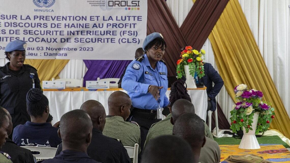 La Composante police de la MINUSCA, a organisé un atelier de formation à l’intention d’une trentaine d’éléments des Forces de sécurité intérieure (police et gendarmerie), de membres des comités locaux de sécurité (CLS) et de leaders communautaires de Damara, située à 75 km de Bangui, le 2 et 3 novembre 2023. Cette session avait pour but de sensibiliser et d’impliquer les participants dans la prévention et la lutte contre les discours de haine, les rumeurs et la désinformation qui peuvent être à l’origine de multiples conflits.
