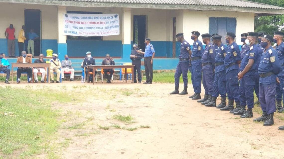 La MONUSCO a organisé, du 25 novembre au 4 décembre 2020, une session de formation des formateurs au profit de 22 agents de la Police Nationale Congolaise (PNC) du Commissariat territorial de Demba, localité située à 65 kilomètres de la ville de Kananga, dans la province du Kasaï Central. Au moment où la Mission s’apprête à quitter la région, cette session avait pour objectif de former des futurs formateurs capables d’assurer la continuité des activités de formation pour améliorer le niveau professionnel des policiers.
