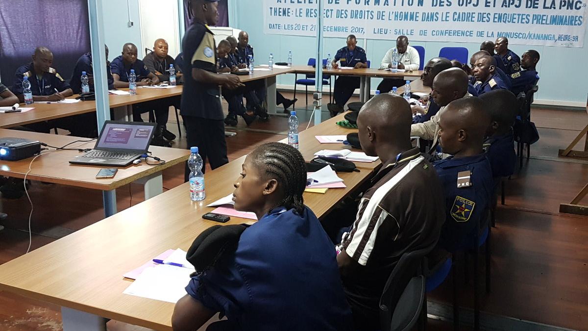 Dans le cadre de l’exécution du mandat de la MONUSCO en son volet renforcement des capacités de la PNC, le BCNUDH MONUSCO-KANANGA en collaboration avec UNPOL, a organisé les 20 et 21 décembre 2017 dans la salle de conférences du HQ MONUSCO-KANANGA, une formation à l’intention des Officiers de Police Judiciaire de la Garnison de KANANGA, sur « LE RESPECT DES DROITS DE L’HOMME DANS LE CADRE DES ENQUETES PRELIMINAIRES (Arrestations et détentions) ».