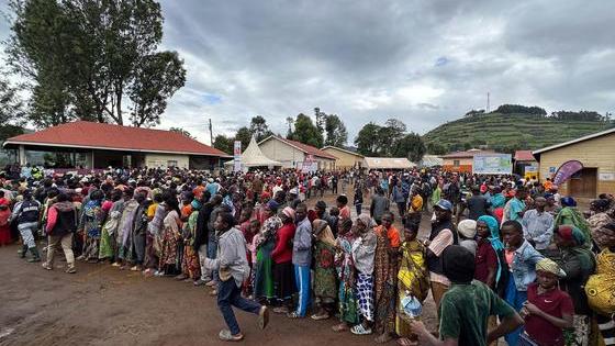 Des personnes déplacées font la queue pour recevoir l'aide du PAM dans la province du Sud-Kivu, en République démocratique du Congo. Photo : PAM/Musa Abema