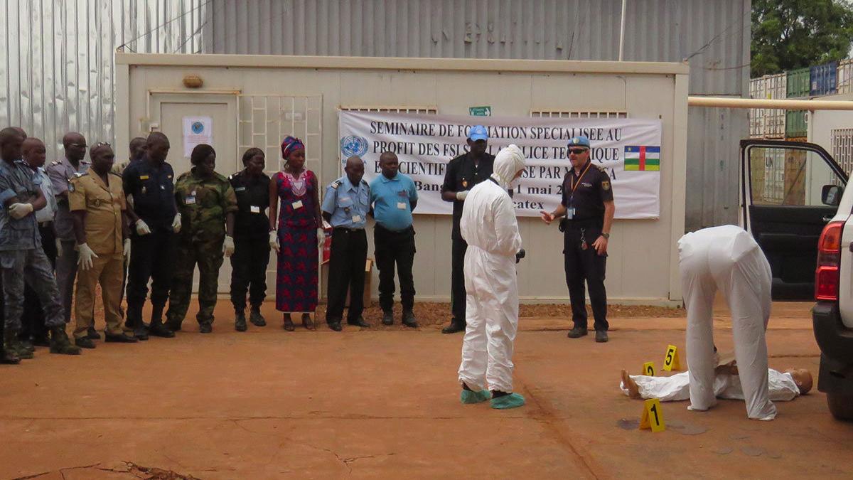 Seize éléments des Forces de sécurité intérieures dont six de la section de Recherches et d’investigations (SRI), six autres de la direction des services de police judiciaire (DSPJ) et quatre de l’Unité mixte d’intervention rapide et de répression des violences sexuelles faites aux femmes et aux enfants (UMIRR), ont été formés, du 3 au 11 mai 2018, aux opérations de police technique et scientifique. L’objectif de cette formation organisée par la composante Police de la MINUSCA était de maitriser les techniques d’enquêtes sur les scènes de crimes, notamment la recherche d’indices et d’éléments matériels de preuve et de comparaison. Plusieurs thématiques ont été abordés au cours des travaux, notamment des modules théoriques et exercices pratiques sur les techniques d’exhumation de corps, la gestion et l’identification des dépouilles, la gestion des scènes de crime, la dactyloscopie, la signalisation et la rédaction de rapports techniques. Rappelons que la composante Police de la MINUSCA et les forces de sécurité intérieure ont mis sur pied un plan de renforcement des capacités de la Police et de la Gendarmerie nationales, afin de permettre à ces dernières d’exécuter leurs missions avec efficacité et en conformité avec les standards internationaux.