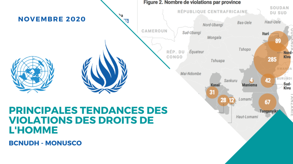 Durant le mois d’octobre 2020, le BCNUDH a documenté 611 violations des droits de l’homme sur tout le territoire de la République démocratique du Congo, soit une diminution de près de 16% par rapport au mois de septembre (726 violations). Cette diminution reflète la baisse de 19% du nombre de violations attribuables à des agents de l’Etat, ainsi que d’une diminution de 13% d’atteintes commises par des combattants de groupes armés.