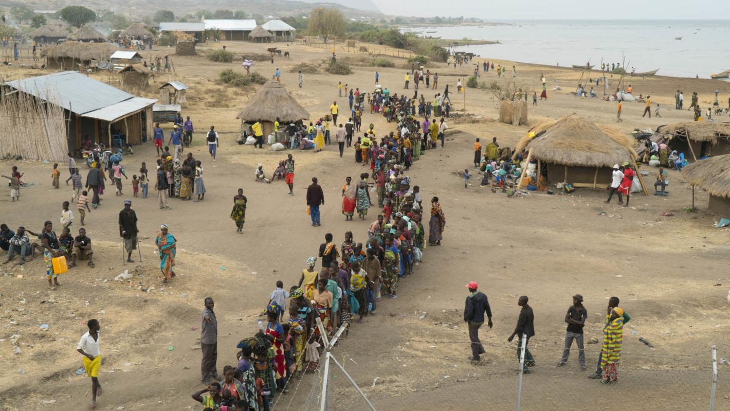 Des personnes déplacées font la queue pour recevoir l'aide du PAM dans la province du Sud-Kivu, en République démocratique du Congo. Photo : PAM/Musa Abema