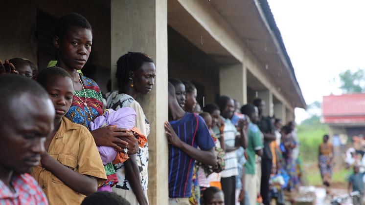 Des personnes déplacées font la queue pour recevoir l'aide du PAM dans la province du Sud-Kivu, en République démocratique du Congo. Photo : PAM/Musa Abema