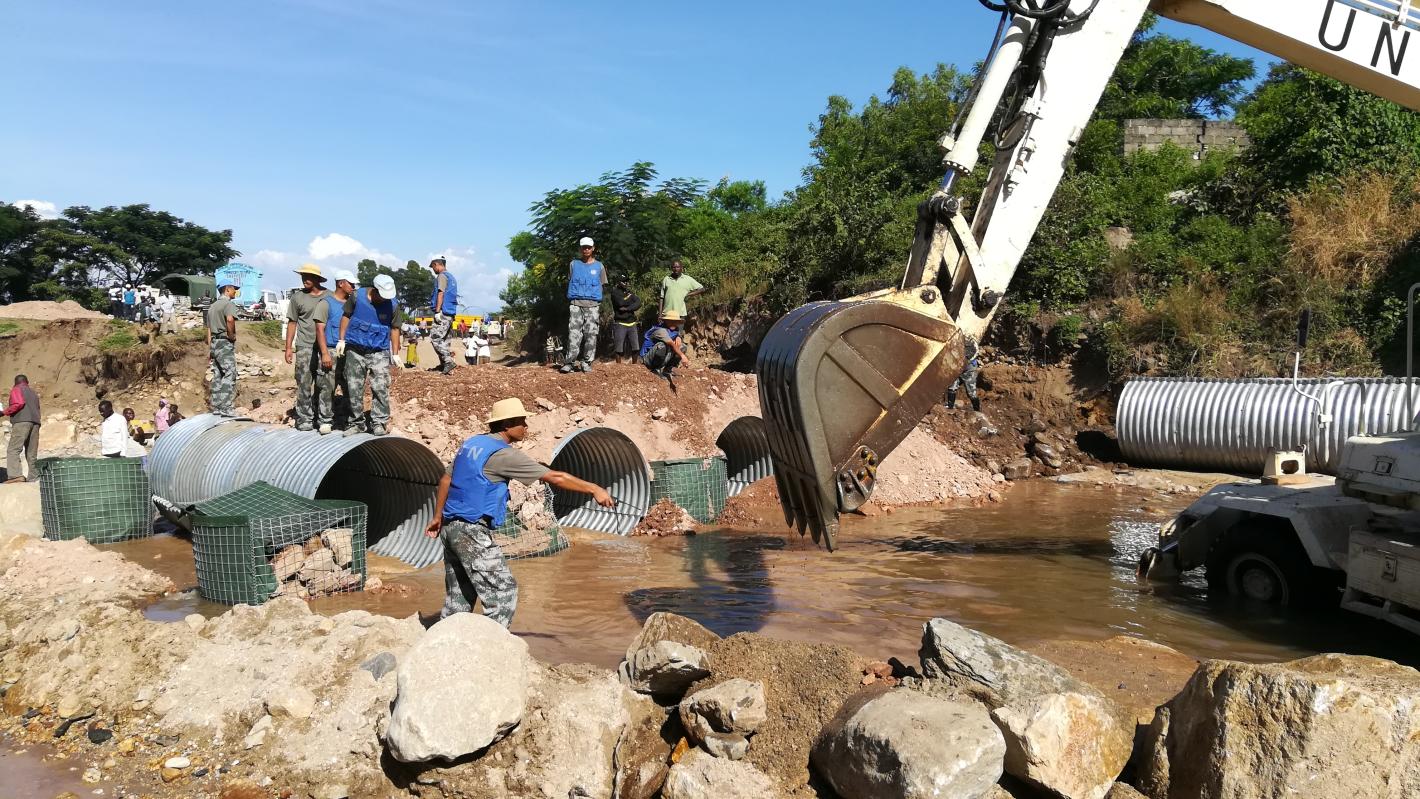 Uvira, le 29 mai 2018 – Le contingent chinois de la MONUSCO a débuté lundi dernier les travaux d’aménagement du pont Kawizi. Il s’agit de créer déviation temporaire sur le cours d’eau en vue de faciliter le trafic sur ce tronçon vital de la route nationale RN5.