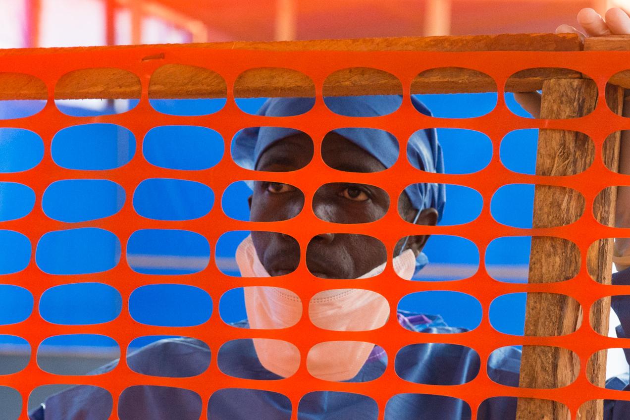Derrière une clôture rouge en filet, la nourrice Fanta Camara donne un bain à Massidigbe, un an et demi, dans la crèche du centre de traitement Ebola (CTE) à Nzérékoré, située dans la zone forestière de la Guinée. C’est une…