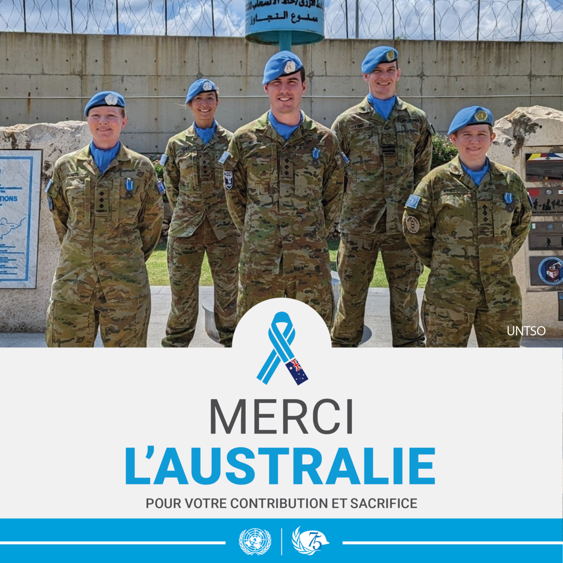 AustralieMai 2023 - Les Nations Unies remercient l'Australie pour sa contribution inestimable au maintien de la paix.Communiqué de presse (en anglais). Last updated: Mardi 14 janvier 2025 - 21:26Share