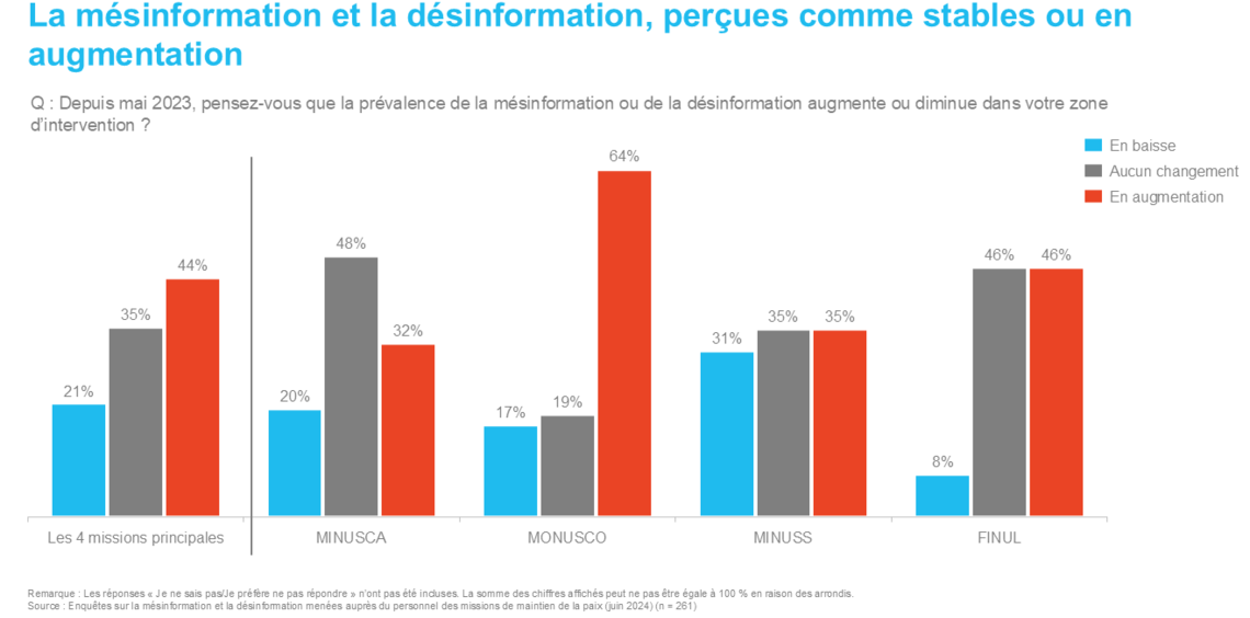 Comment les casques bleus perçoivent-ils ce défi ?En 2024, une enquête interne menée auprès du personnel de maintien de la paix a révélé que les informations préjudiciables restent une menace importante pour les opérations de maintien de la paix. Presque toutes les missions ont constaté une hausse de la mésinformation ou de la désinformation dans leur zone d’intervention. Interrogés sur la propagation de la mésinformation et de la désinformation, 44 % des membres du personnel des quatre missions principales ont indiqué avoir noté une augmentation de la prévalence de la mésinformation et de la désinformation.