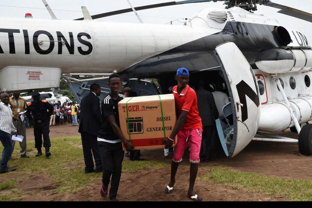 La mission de maintien de la paix des Nations Unies en RDC a fourni une assistance au processus électoral. En mars 2017, un groupe électrogène est déchargé d'un hélicoptère de l'ONU à Popokabaka, dans le sud-ouest du Congo. «…
